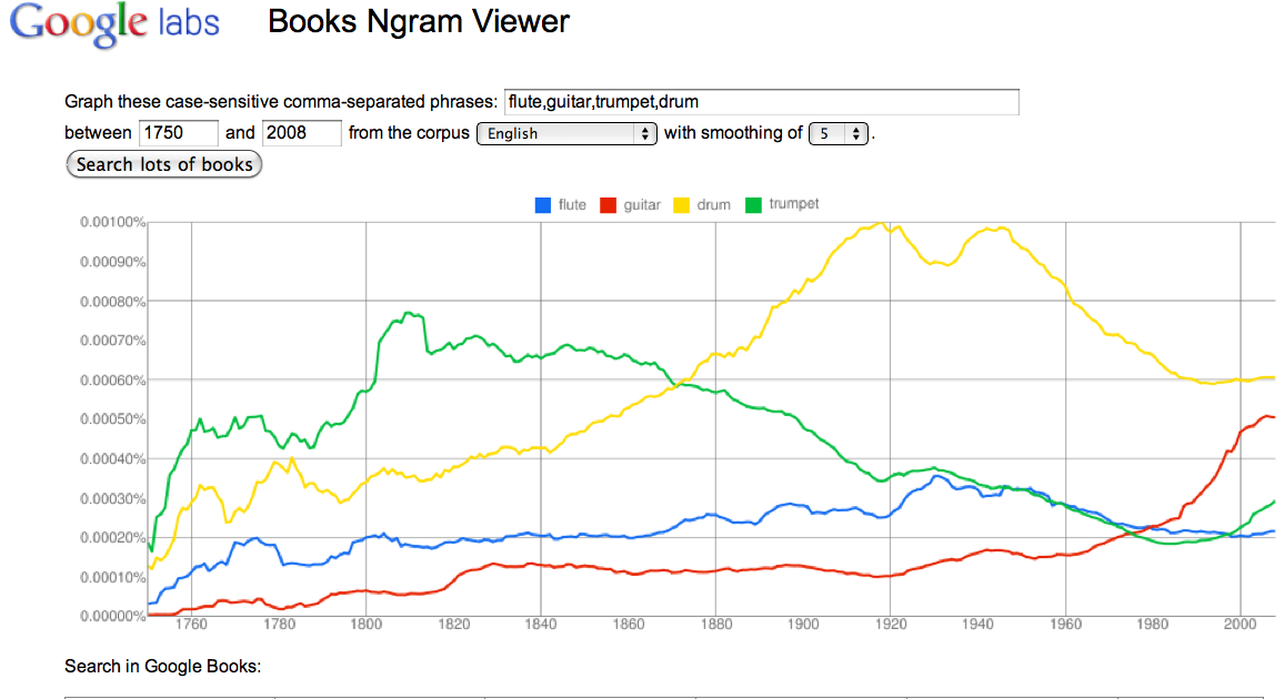 Google Books Ngram Viewer allows you to chart the frequency of a given word or phrase in over 52 million books published between 1500 and 2008 and now digitized by Google. Part-of-speech tags cook_VERB _DET_ President. Or all of it if you have the bandwidth and space.